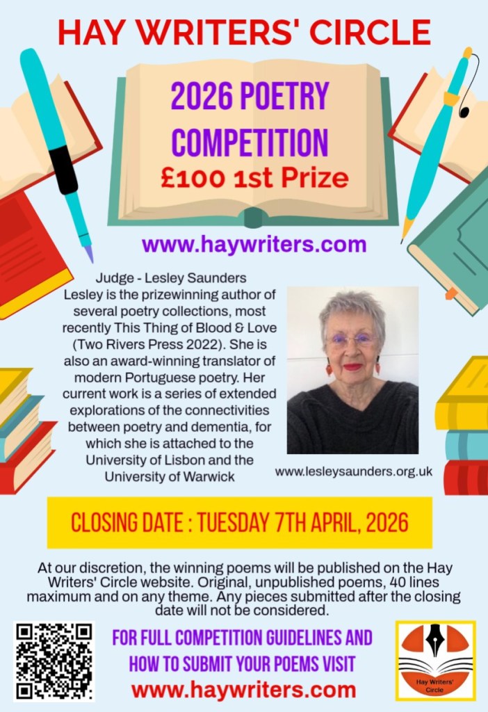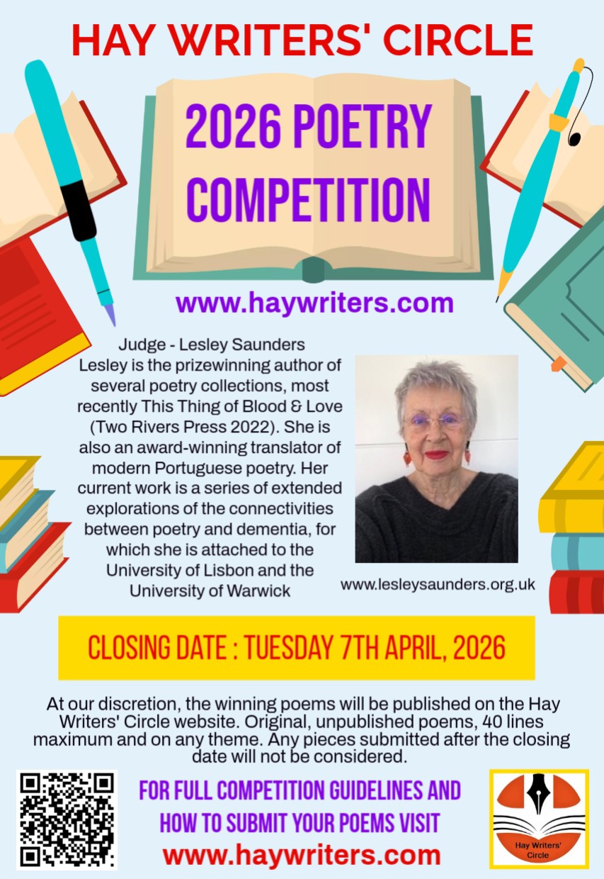 Submissions are now invited for the annual Hay Writers’ Circle Poetry Competition, and we are thrilled to announce the judge for 2026 is the wonderful Lesley Saunders. The theme this year is entirely open and we hope to receive a wide variety of poems and poetry styles for this competition. The first prize winner will receive £100 prize money, with cash prizes for 2nd and 3rd placed poems.