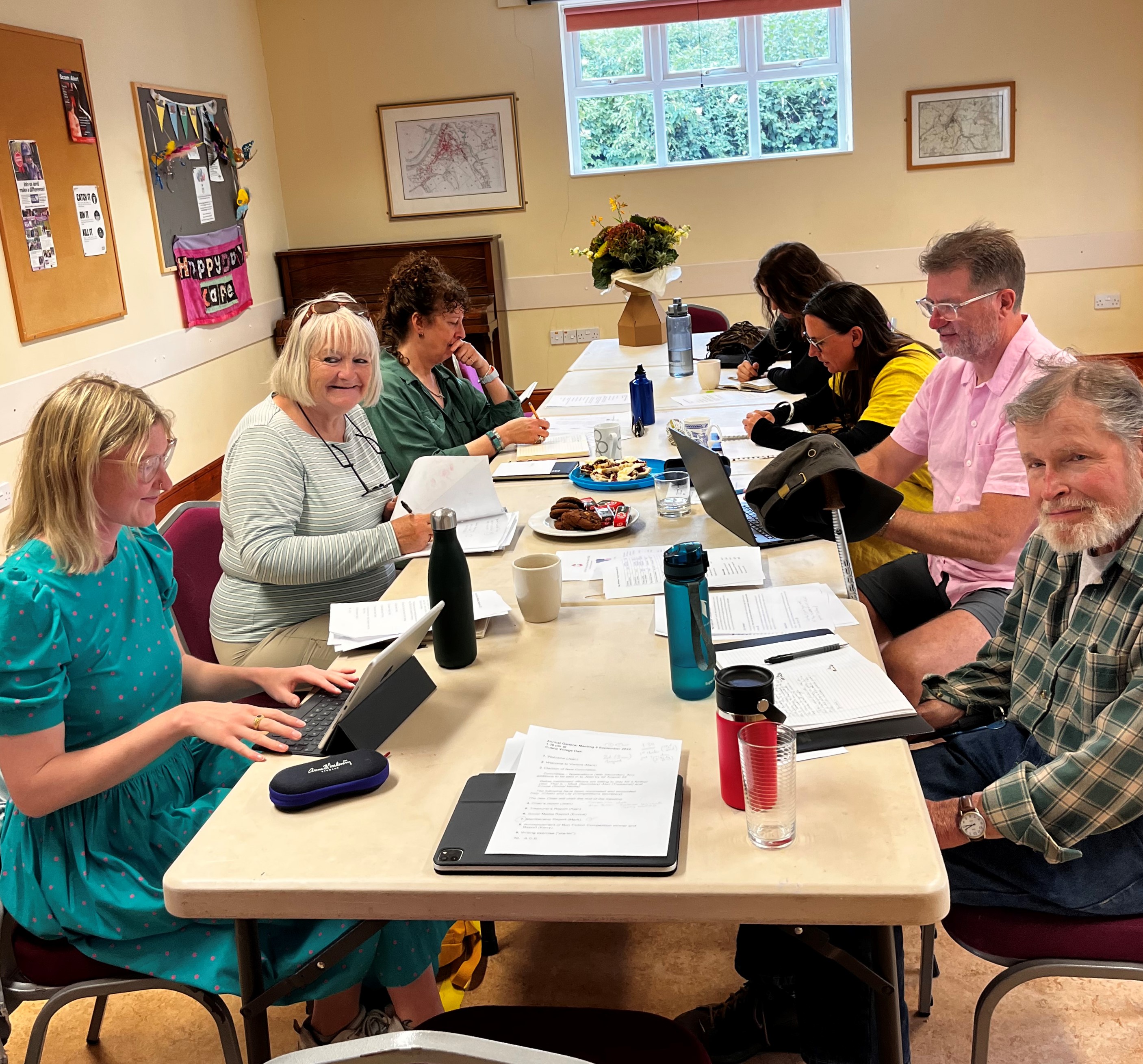 After enjoying a month (mostly) in the sun, we are all itching to get back to writing again. Here are some of the group at our last meeting in Cusop Village Hall. The eagle-eyed among you may notice some cakes in the centre of the table – these were naturally for incentive purposes only … although Jean’s smile says otherwise!
