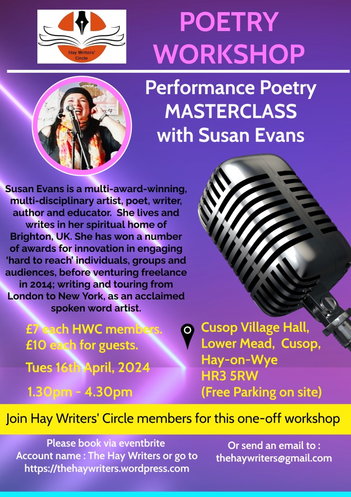Limited places are still available at our one-off Performance Poetry Masterclass with our competition judge, Susan Evans. Reserve your place via the Eventbrite link on our Events page.