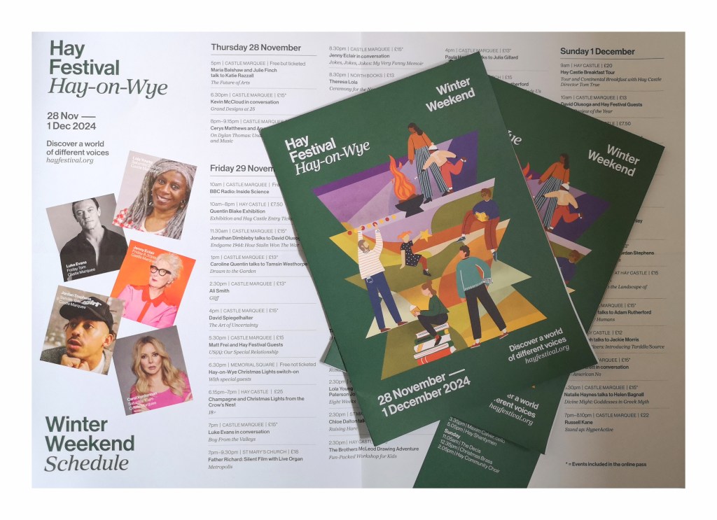 It’s less than a month to go before Hay Festival welcomes us all to it’s Winter Weekend, 28th November – 1st December 2024. It’s definitely something to brighten the darkening days and place us firmly on the road to seasonal celebrations ahead.