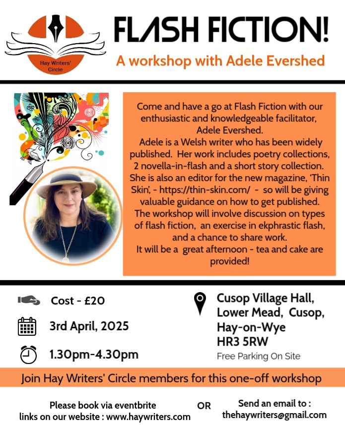 We are delighted to announce details of our forthcoming Flash Fiction workshop with author and educator, Adele Evershed. It will be an in-person event. Anyone over 18 years of age can attend on Thursday 3rd of April, at Cusop Village Hall. Please arrive at 1pm, the workshop runs from 1.30pm-4.30pm (free parking, tea and cake provided).