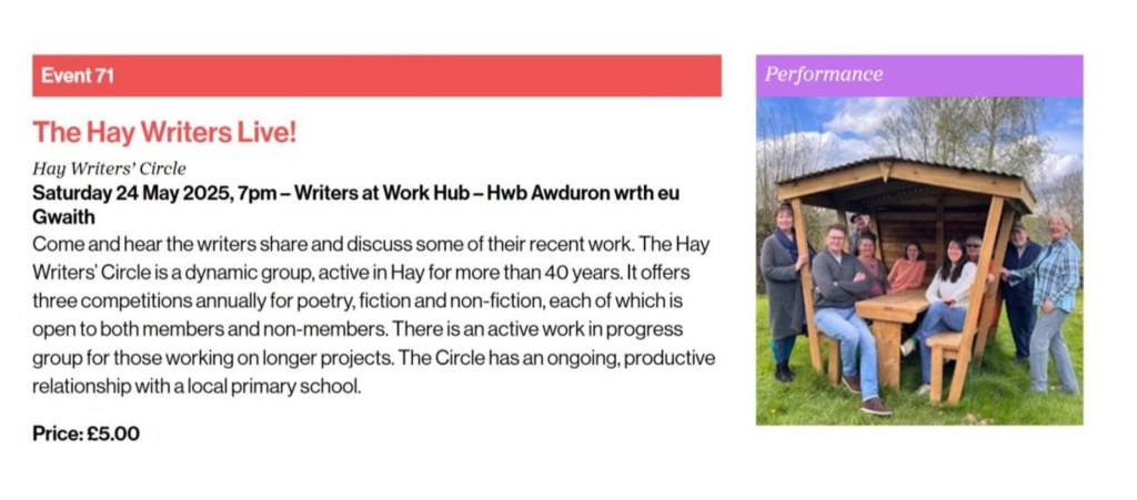 Come and hear the writers share and discuss some of their recent work. The Hay Writers’ Circle is a dynamic group, active in Hay for more than 40 years. It offers three competitions annually for poetry, fiction and non-fiction, each of which is open to both members and non-members. There is an active work in progress group for those working on longer projects. The Circle has an ongoing, productive relationship with a local primary school.