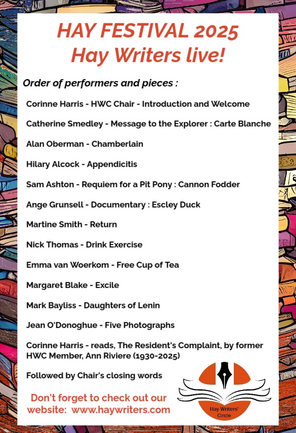 It’s full steam ahead for rehearsals for our Hay Writers Live! event at Hay Festival 2025. As we continue to hone our performance, we are delighted to release the full program of readers and pieces. All are new works enjoying their first public airing. We will be showcasing a variety of pieces including competition winners, novel extracts, poetry, short stories and more!