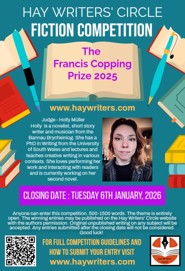 The competition is open to everyone, members of Hay Writers’ Circle and non-members too. Pieces of 500-1500 words on any fiction theme are accepted. Closing date for entries is Tuesday 6th January 2026. Prizes are awarded for first, second and third place.